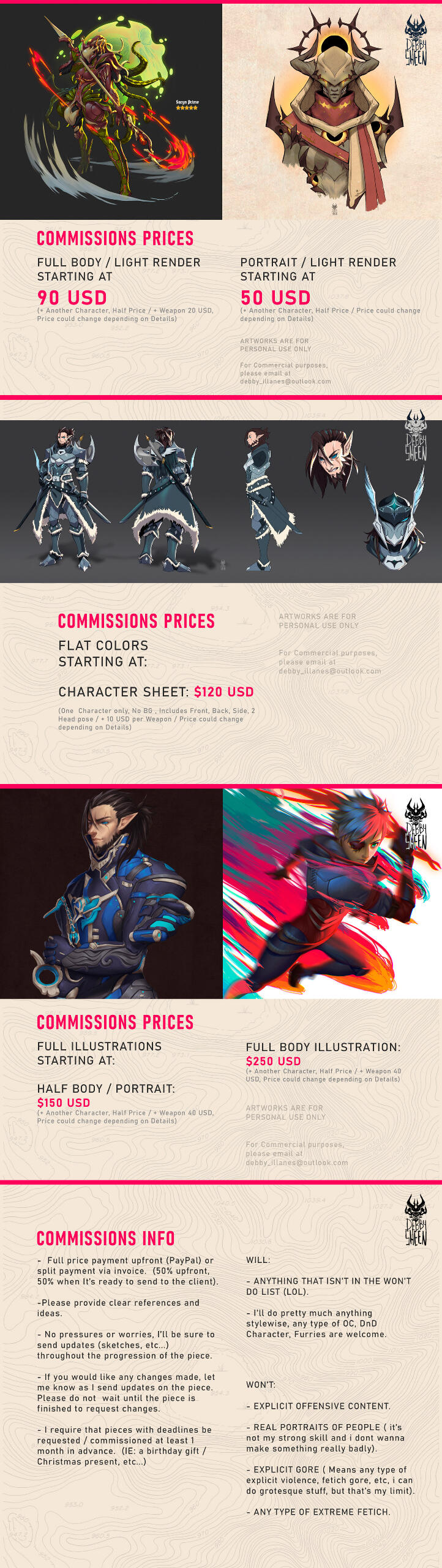 Prices listed are only base price, it can change depending on the subject, if it's too detailed, character quantity, add-ons like weapons or companion, background, NSFW, etc. you can always ask first if you have the references on hand, so i can give you a final price.For Commercial Work: